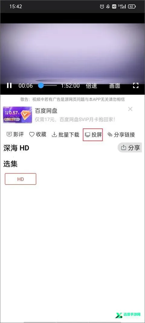 3、在播放界面下方有很多的功能选项,点击“投屏”按钮。