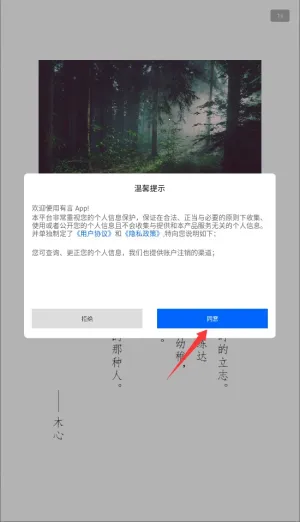 1、首次启动应用时,系统会显示用户协议和隐私政策,阅读后点击同意按钮进入主界面。
