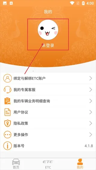 3、在个人页面,显示【未登录】状态,可进行【绑定与解绑ETC账户】,点击头像区域可进入登录流程。