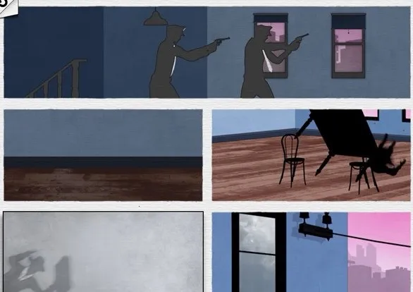 如下图所示调转图片位置,当警察开枪射击的时候,主人公飞身一跃,桌子侧翻在地挡住了子弹,主人公便可以趁此机会跳窗逃走!正字啊看小编此篇致命框架攻略的你是不是也被主人公矫健的身姿所折服!